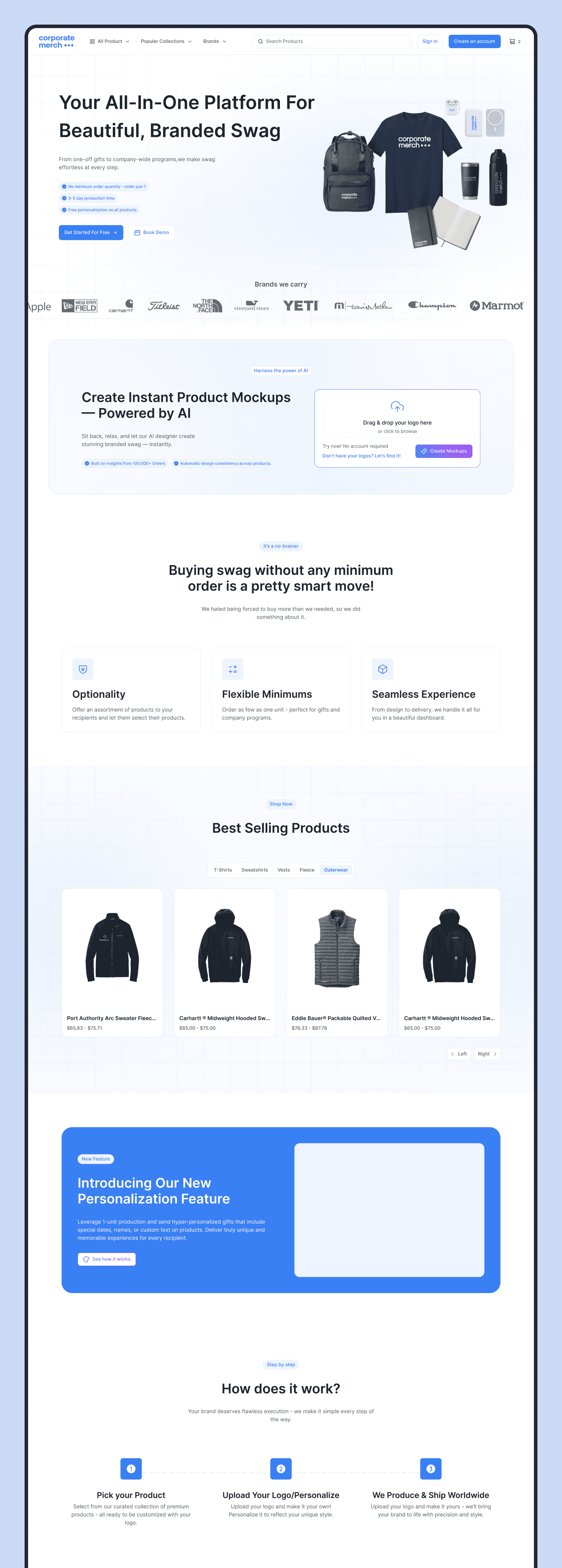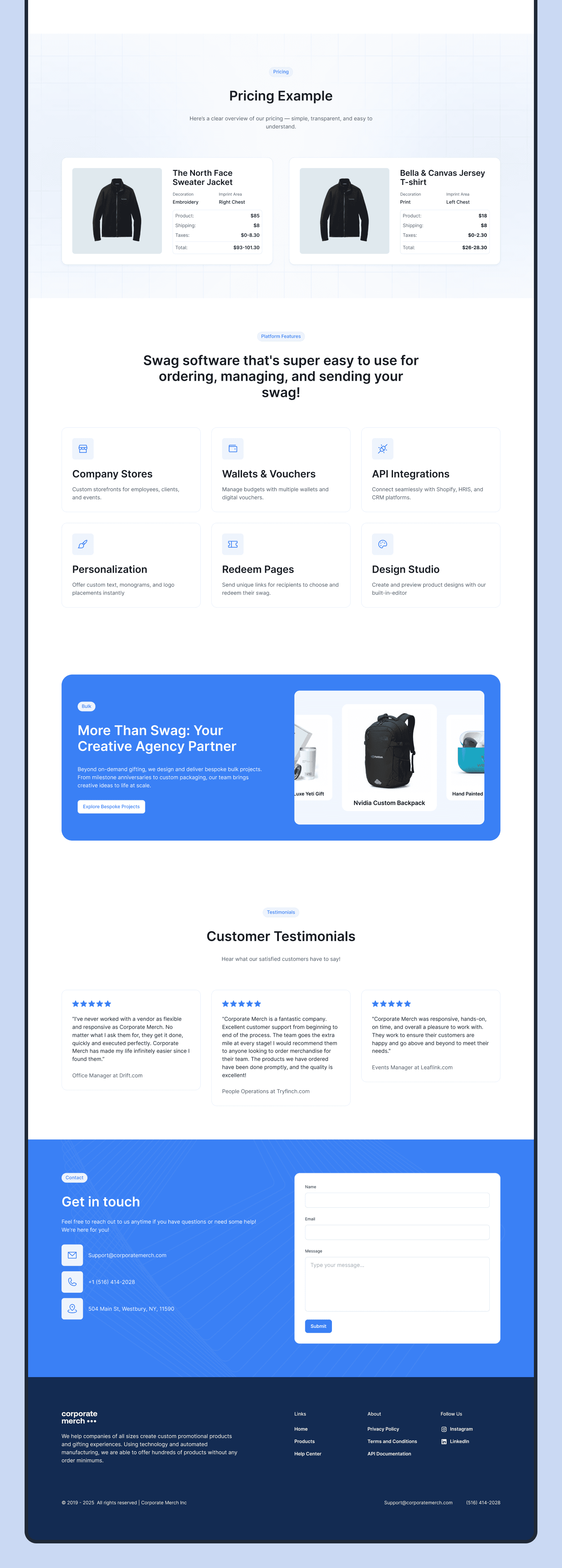 CorporateMerch is an API-powered SaaS platform that streamlines the way businesses create, store, and distribute branded swag worldwide. This project focused on building a robust B2B e-commerce ecosystem that connects inventory management with a seamless shopping experience, allowing companies to manage high-quality corporate gifts at scale.
