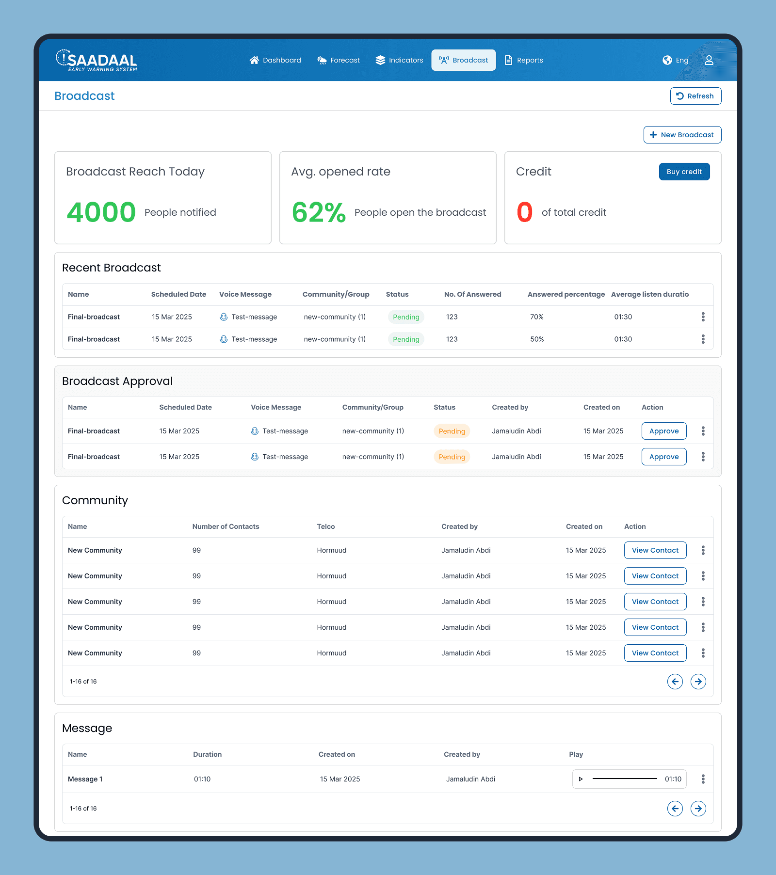 Redesigned the Saadaal EWS dashboard to improve usability, navigation, and visual hierarchy. I focused on creating a role-specific experience that balances deep data analytics with immediate, life-saving alerts for community agents and administrators.
